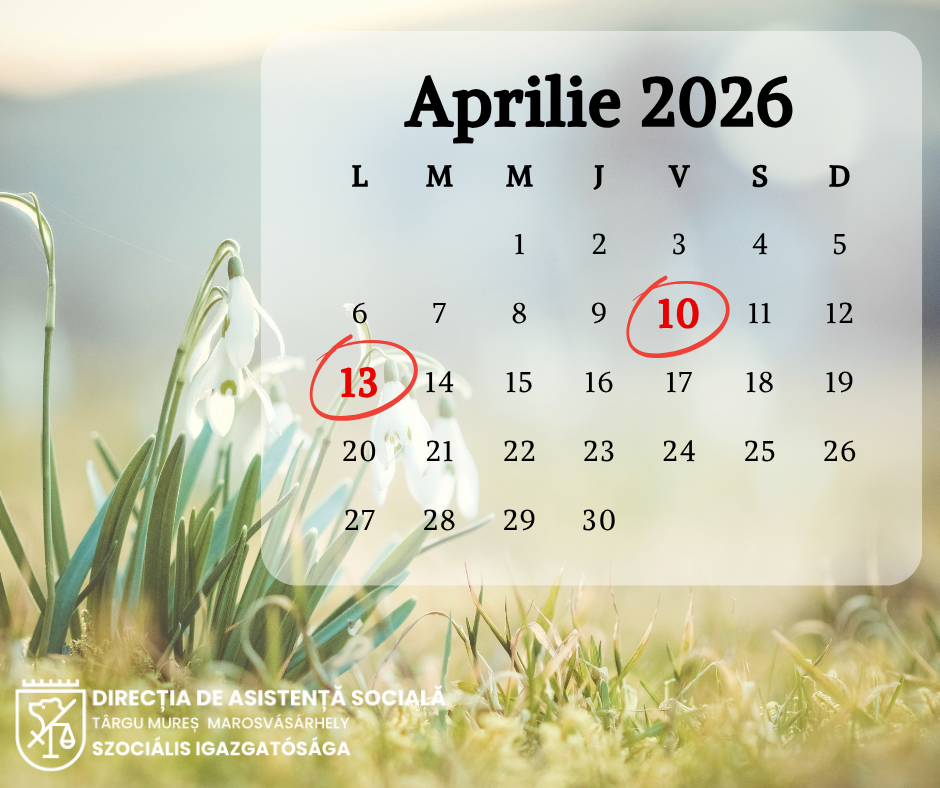 Direcția de Asistență Socială Târgu Mureș aduce la cunoștința persoanelor interesate că nu va avea program de lucru cu publicul vineri, 10 aprilie 2026 (Vinerea Mare) și luni, 13 aprilie 2026 (A doua zi de Paște), fiind decretate prin lege ca zile libere nelucrătoare.